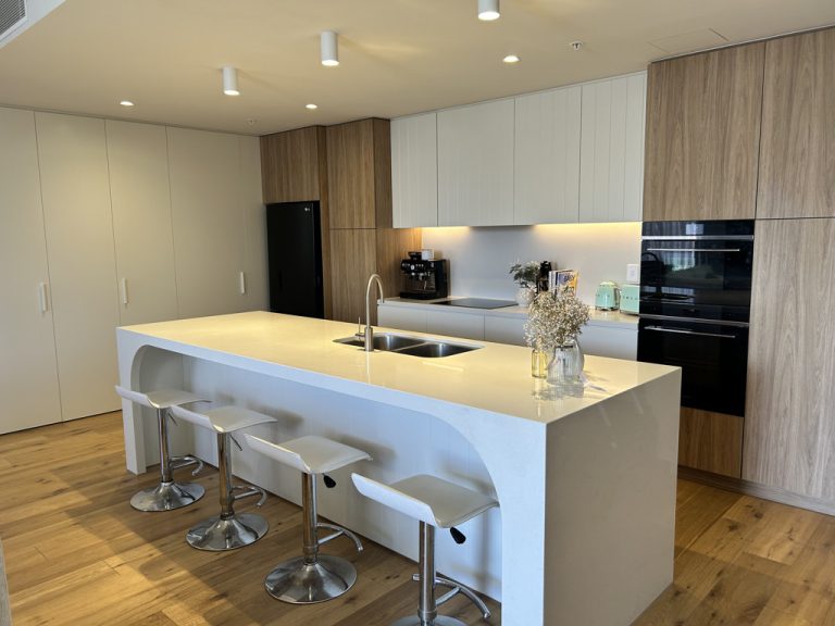 The designer kitchen is both stylish and functional, featuring Smeg appliances, gas cooktop, integrated dishwasher, stone benchtops, extensive cabinetry, fridge plumbing and a striking curved island bench that reflects the building’s Art Deco design language.